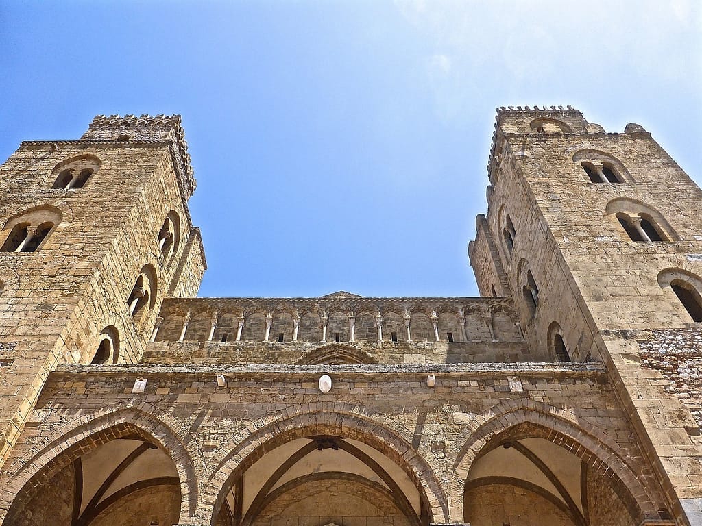 La pietra dorata di questo meraviglioso gioiello di architettura romanica, che si erge con il profilo di alcune palme, si fonde con la falesia calcarea chiamata la Rocca. L’edificio venne eretto tra il 1131 e il 1240 in seguito a un voto del re normanno Ruggero II, che stava per naufragare durante il suo ritorno da Napoli. A differenza della cattedrale di Palermo, il Duomo di Cefalù conserva un evidente carattere normanno, che si manifesta soprattutto nella facciata incorniciata da torri e nell’alta abside fiancheggiata da absidiole più piccole.